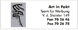 | Art in Fakt , Vor dem Steintor 149/151 | 70 26 46 / Fax 70 26 78 |